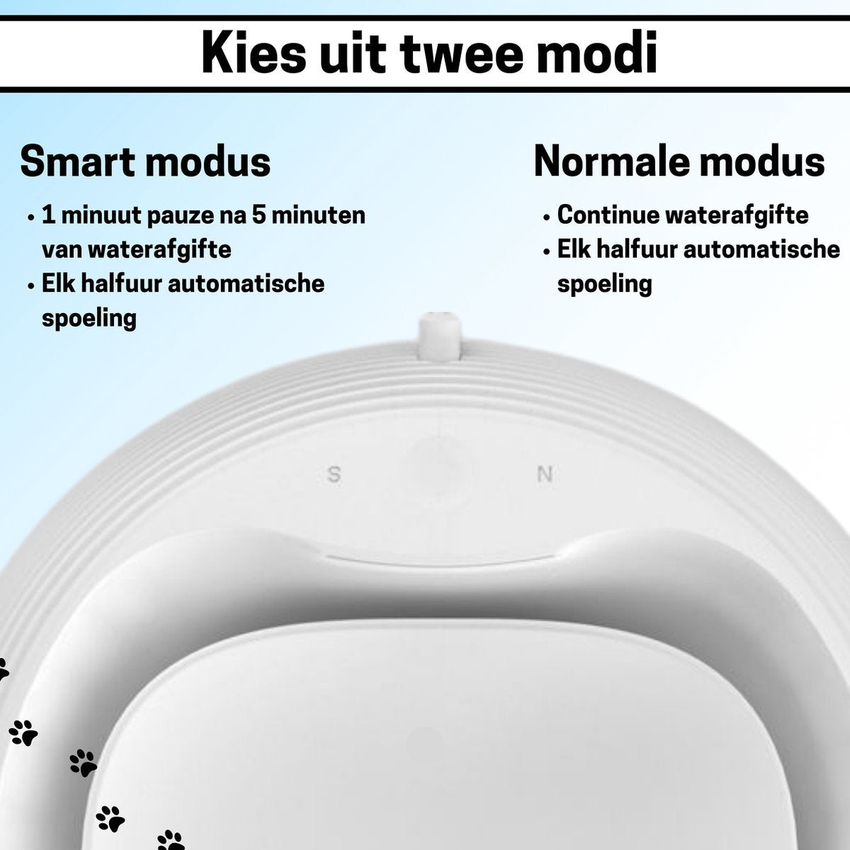 Avec la fontaine BOME, vous pouvez choisir entre deux modes différents. Un débit d'eau continu ou un mode économe en énergie. En mode économie d'énergie, la fontaine fait une pause d'une minute toutes les 5 minutes. Toutes les 30 minutes, elle rince automatiquement l'abreuvoir. La fontaine est fabriquée dans un matériau sans bpa, ce qui la rend totalement sûre pour votre animal de compagnie.