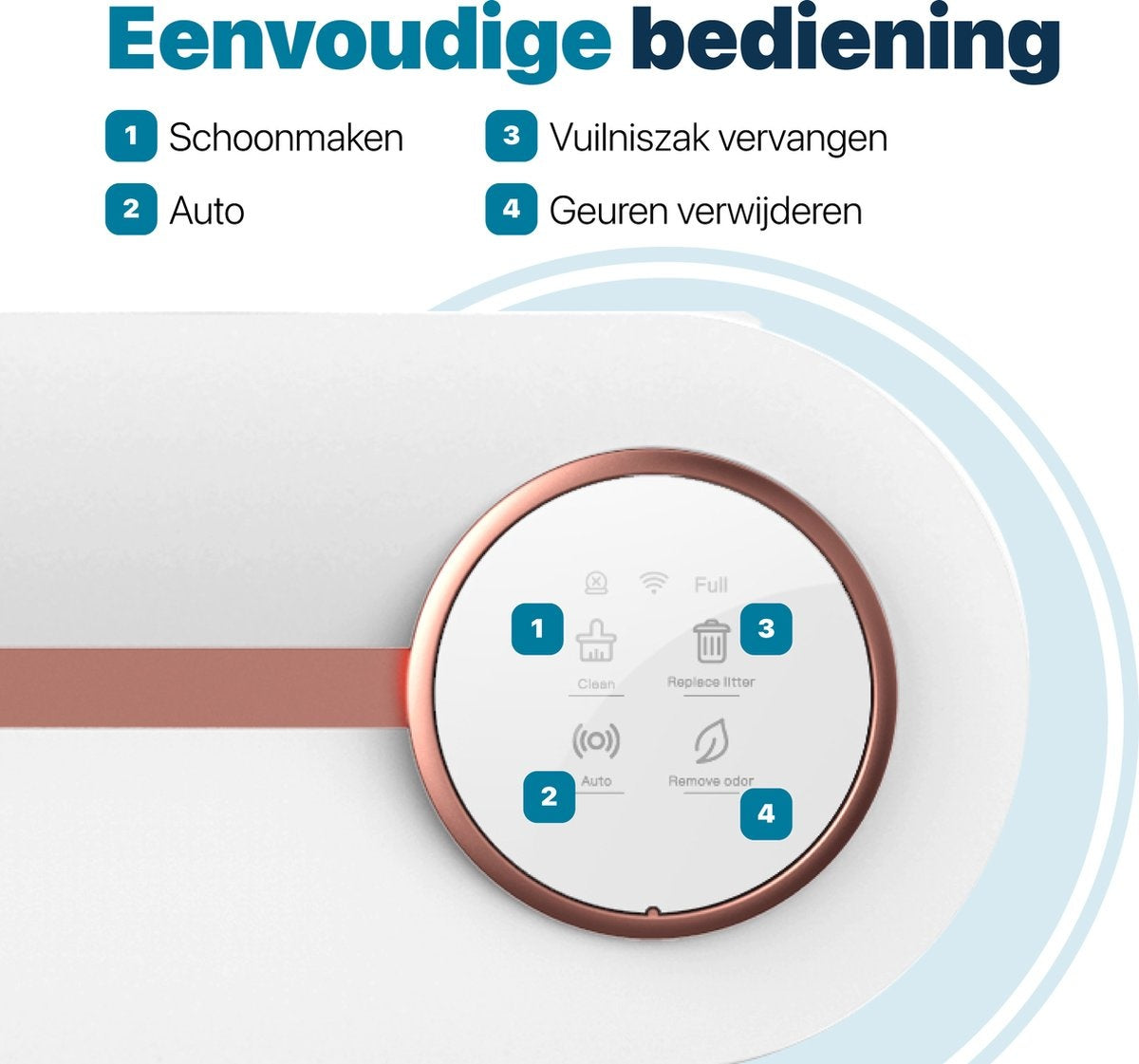 L'appareil est rapide et facile à utiliser grâce à l'écran tactile LED intégré. Vous souhaitez en savoir plus sur votre chat et pouvoir contrôler l'appareil à tout moment ? C'est possible grâce à l'application gratuite. L'application indique la fréquence de présence de votre chat dans le bac à litière, la durée d'utilisation, le poids de votre chat et bien plus encore ! En outre, vous pouvez commander à distance, par exemple, les processus de nettoyage, activer le verrouillage des enfants ou rendre le bac à litière silencieux. Vous avez donc le contrôle de l'appareil à tout moment.