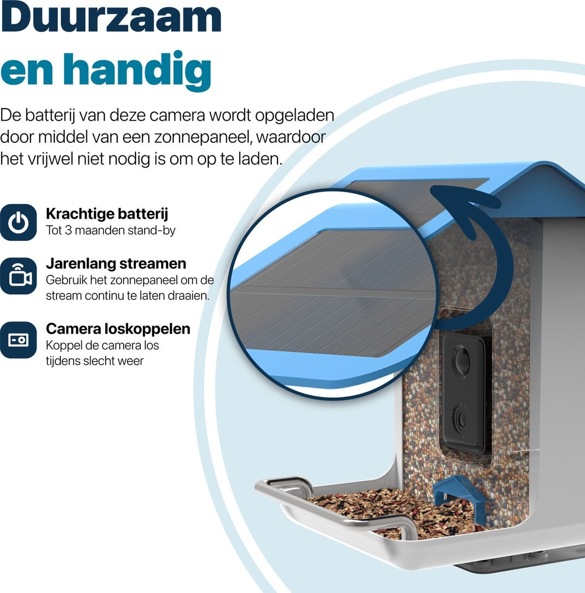 La mangeoire pour oiseaux BOME avec caméra est également équipée de fonctions de haute qualité telles que la transmission d'images à grande vitesse via Wi-Fi, de sorte que vous pouvez visualiser les images en direct sur votre smartphone, votre tablette ou votre ordinateur. La mangeoire a une conception robuste et résistante aux intempéries, ce qui la rend durable et permet une utilisation à long terme dans différentes conditions météorologiques. La caméra est rechargée en permanence par le panneau solaire intégré. Cela la rend durable et agréable à utiliser. En fait, il est rarement nécessaire de la recharger !