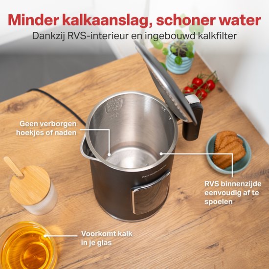 Avec une puissance de 2200W, cette bouilloire affiche un temps de chauffe rapide : en 90 secondes, vous obtenez déjà de l'eau à 70°C - idéale pour une savoureuse tasse de thé, sans cliquetis gênant. Parfait pour un petit coup de pouce le matin ou un moment de détente le soir ; avant même de vous en rendre compte, votre tasse sera prête.