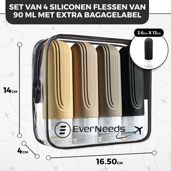 Expérimentez la commodité des contenants de voyage durables EverNeeds. Ce lot de quatre flacons en silicone de 90 ml est idéal pour votre bagage à main, afin que vous n'ayez pas à vous inquiéter lors des contrôles de sécurité. Le set est livré avec un sac transparent, une feuille d'autocollants pour étiqueter les flacons et une étiquette de bagage pour une identification facile. Parfait pour les voyages, le sport et l'organisation de votre environnement domestique.