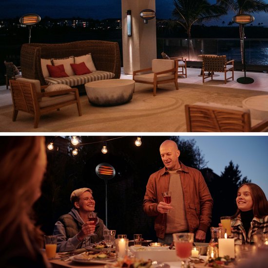 Extra space - you're in control ! Grâce à sa conception résistante aux éclaboussures (IP34), ce chauffage de terrasse électrique convient aussi bien à l'intérieur qu'à l'extérieur, même sous un peu de pluie.Élégant, sûr et écologique