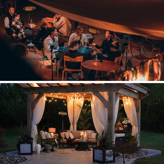 - Intérieur et extérieur : Grâce à sa conception anti-éclaboussures, ce chauffage est parfait pour les jours de pluie, mais aussi pour une utilisation dans une véranda ou un jardin d'hiver.