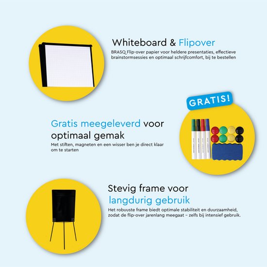 Tout ce dont vous avez besoin est disponible : un plumier pour vos marqueurs, un essuie-glace pour tableau blanc, quatre marqueurs de couleur pour tableau blanc, des aimants colorés et un bloc de 25 feuilles de papier pour tableau à feuilles mobiles. Pas de tracas, commencez tout de suite, c'est aussi simple que cela. Le tableau de conférence est également léger (4,5 kg) et facile à déplacer, idéal si vous changez rapidement d'espace au bureau ou pendant votre formation.