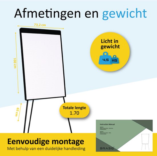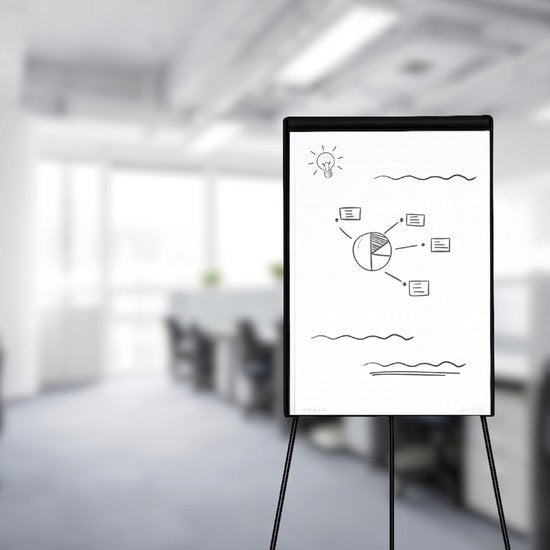 Toujours avoir une idée claire, visible sur papier ou tableau blancAvec un format étendu de 100x70 cm, vous disposez de tout l'espace nécessaire pour présenter des concepts de manière visuelle. Que vous utilisiez du papier pour tableau de conférence ou la surface du tableau blanc, tout reste organisé et facile à lire pour votre public. La hauteur réglable (100 à 165 cm) vous permet de travailler confortablement dans toutes les situations, sans avoir à vous pencher ou à vous étirer. Le trombone à crochets réglables permet de changer les feuilles rapidement et sans souci.
