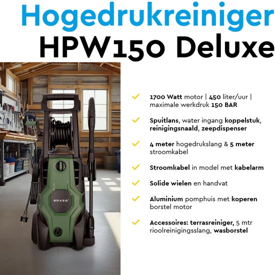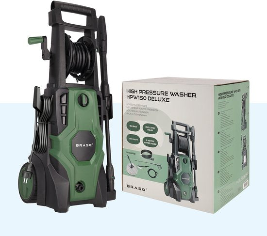 BRASQ Nettoyeur haute pression Deluxe - Nettoyeur de terrasse - Pulvérisateur haute pression - 1700W - 150 bar - 450 L/H - Kit complet