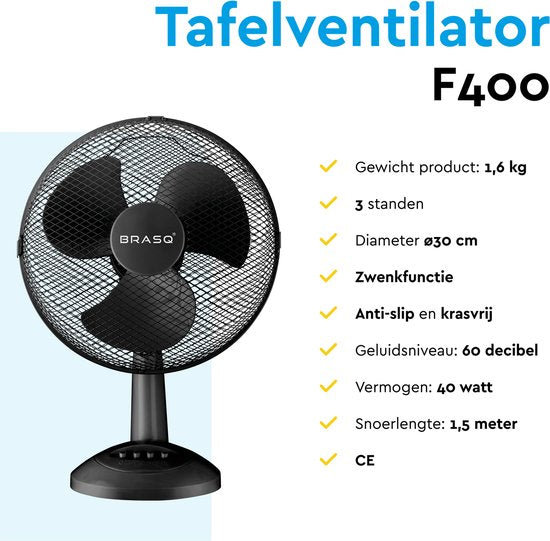 BRASQ Ventilateur de table - 30 cm - Noir - 3 vitesses - Ventilateur de table - 40 watts