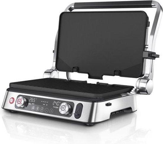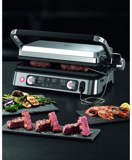 Braun 0X17900007. Couleur du produit : Noir, Acier inoxydable, Matériau du boîtier : Acier inoxydable, Facteur de forme : Rectangulaire. Puissance : 2200 W, Tension d'entrée AC : 220-240 V, Fréquence d'entrée AC : 50-60 Hz. Largeur : 445 mm, Profondeur : 355 mm, Hauteur : 180 mm. Contenu de l'emballage : Thermoprobe 2200 W Rectangulaire Nombre de fonctions : 3 Nombre de programmes de cuisson : 3 Revêtement antiadhésif Surface de gril : 851 cm² Couvercle Pieds Affichage intégré Noir, Acier inoxydable