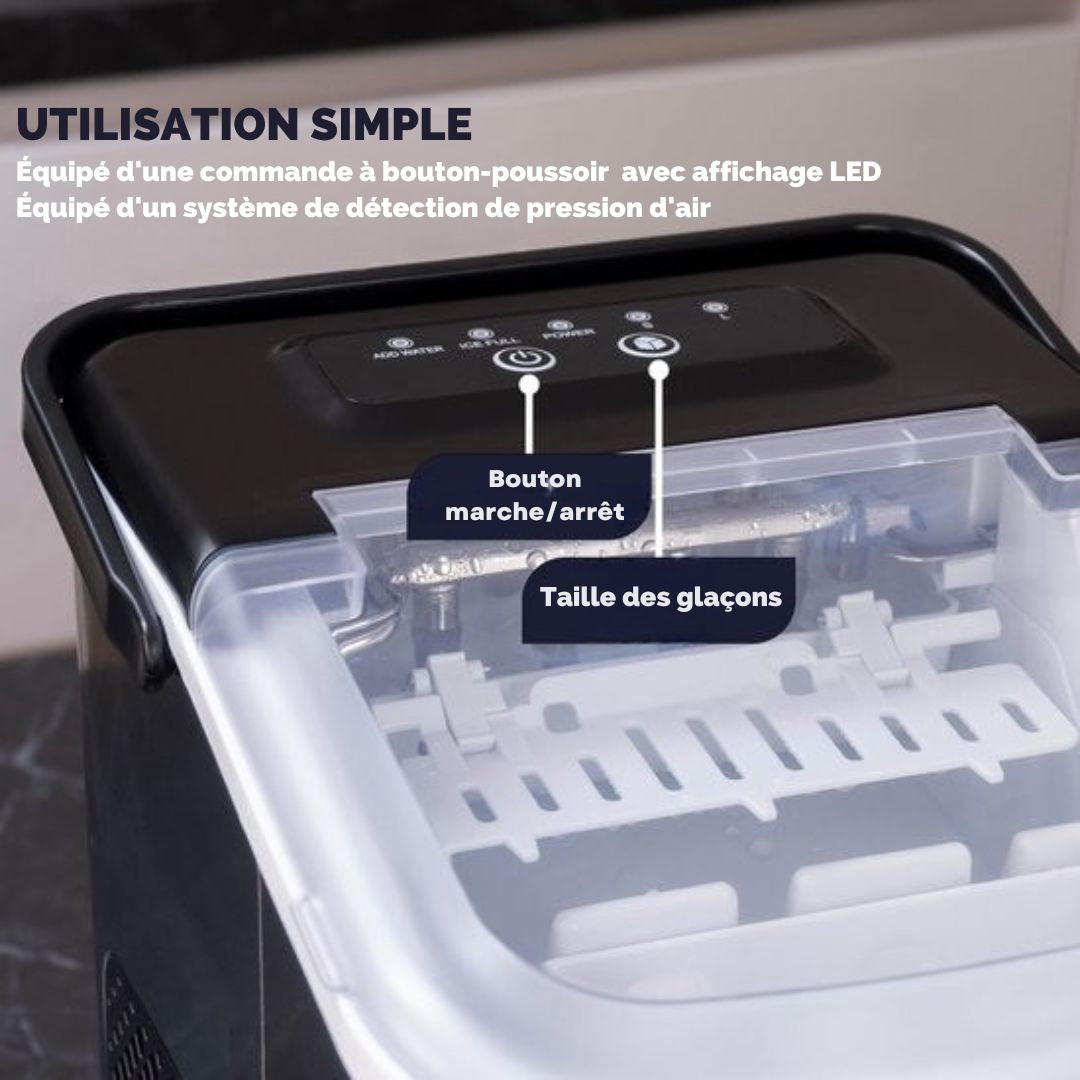 La machine s’éteint automatiquement après utilisation, évitant toute consommation inutile. En produisant vos glaçons à domicile, vous réduisez également les déchets plastiques liés aux sacs de glace jetables.