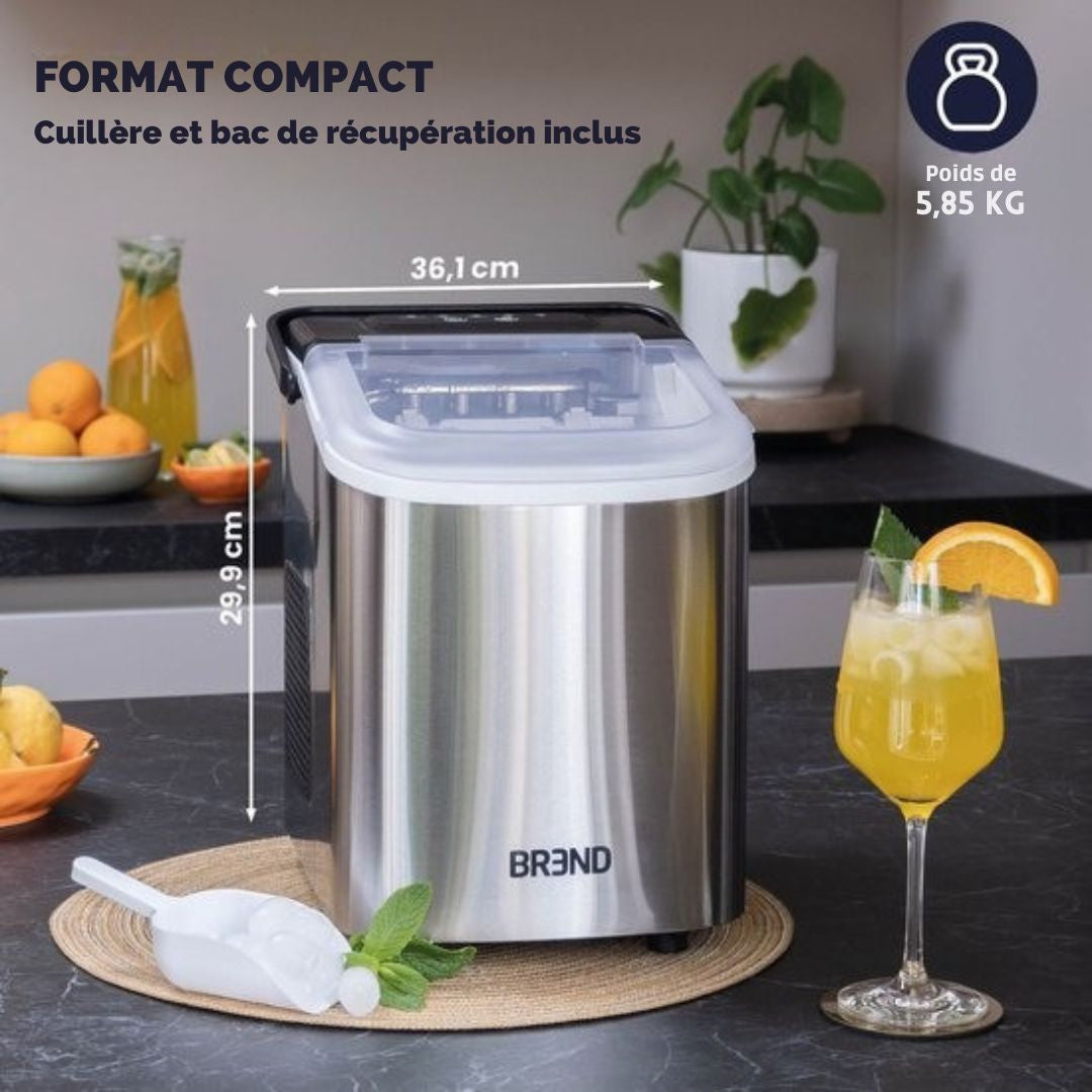 Machine à glaçons BREND - avec cuillère et plateau d'égouttage - Grands L ou petits S glaçons - 10 kg en 24 heures - Argenté