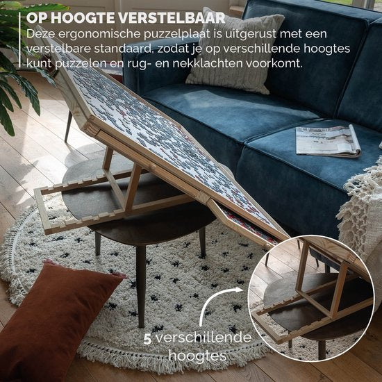 Le support intégré vous permet d'ajuster la plaque de puzzle à cinq angles différents (0°, 28°, 33°, 37°, 40°). Cela vous permet de travailler confortablement et d'éviter les douleurs au cou et au dos, même lors de longues sessions de puzzle.