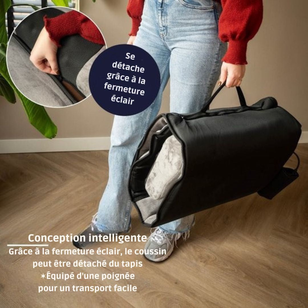 Le point fort de ce modèle réside dans sa polyvalence : l'oreiller de massage peut être détaché grâce à une fermeture éclair pour une utilisation indépendante (idéal pour les pieds ou la nuque). Une fois votre séance terminée, le matelas s'enroule facilement et se transporte comme une petite valise grâce à sa poignée intégrée.