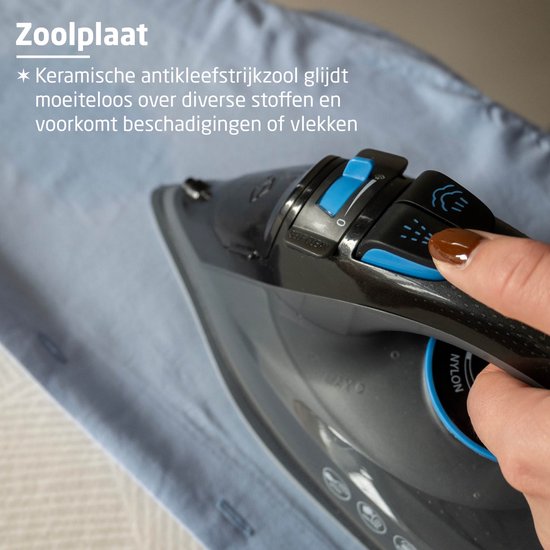 La semelle antiadhésive de qualité supérieure glisse sans effort sur tous les types de tissus, sans accrocher ni laisser de taches indésirables. Vous repassez donc en toute confiance et obtenez d'excellents résultats sur n'importe quel type de tissu.