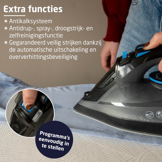 - Comportant de nombreuses fonctions supplémentaires : Fonction vapeur verticale, système anti-calcaire, fonction anti-goutte, spray,