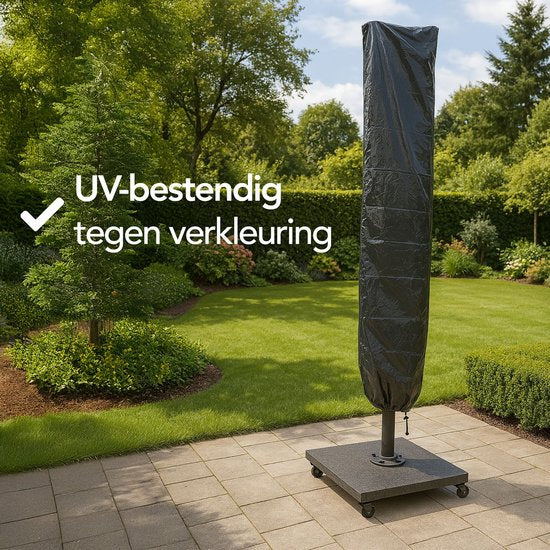 La housse a été spécialement conçue pour les parasols jusqu'à 300 cm de diamètre ou 2,5 x 2,5 mètres de côté. Grâce à sa conception bien pensée (183 cm de long, 25 cm en haut et 35 cm en bas), cette housse s'adapte facilement au parasol. Le cordon de serrage intégré dans le bas garantit que la housse reste bien en place, même en cas de fortes rafales de vent.