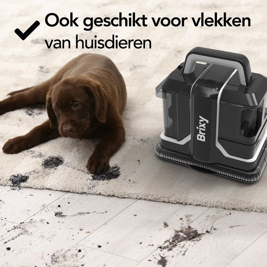 Avec des réservoirs d'eau amovibles (propre : 1,1L, sale : 0,8L), remplissez et videz l'eau sans effort sans en renverser. L'appareil pulvérise de l'eau propre directement sur la tache et refoule immédiatement l'eau sale, de sorte que les surfaces sèchent rapidement. Grâce au cordon extra-long (5m) et au tuyau flexible (1,2m), vous pouvez atteindre tous les coins sans problème. De plus, le Brixy carpet cleaner est conçu pour éviter les fuites.