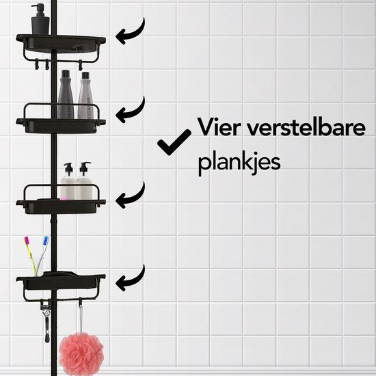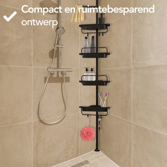Brixy Support de douche - télescopique - 85-305 cm - sans perçage - du sol au plafond - 4 étagères - 3 crochets - noir