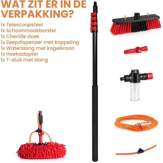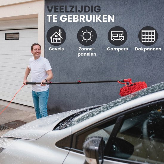 Souffrez-vous de la saleté sur votre façade ?Vous êtes gêné par les fientes d'oiseaux sur vos panneaux solaires ? Avec la brosse de lavage télescopique Shine, vous ne devez plus vous tenir sur une échelle dangereuse. Grâce au manche extensible en 5 parties, qui peut s'étendre de 1,3 à 7 mètres, vous pouvez atteindre sans effort les endroits élevés de votre maison. Que vous souhaitiez nettoyer le toit, faire briller votre véranda ou pulvériser la terrasse : cette brosse à eau se chargera de la tâche.