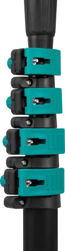 Le tube télescopique peut être réglé facilement en longueur entre 1,30 m et 4,60 m sans aucune étape, grâce aux attaches rapides pratiques. (Conseil : la construction du manche reste plus stable lorsque vous veillez à ce que toutes les parties soient étendues de manière uniforme.)