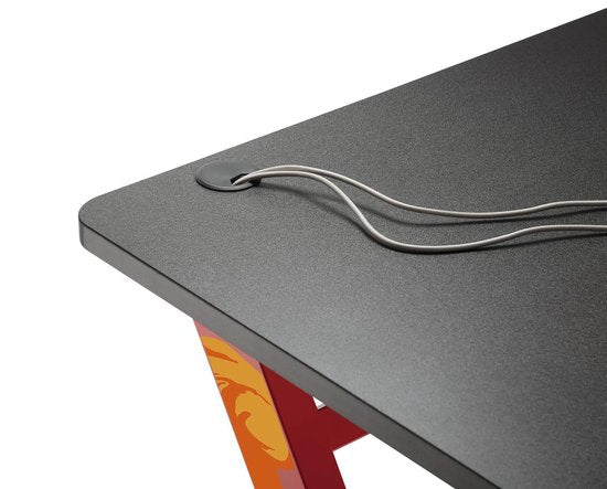 Vous êtes à la recherche d'un bureau de jeu élégant, robuste et bien conçu ? Ce bureau de jeu est doté d'un cadre en acier durable et d'un plateau en panneau de meuble de 25 mm de haute qualité avec une finition en mélamine. La façade arrondie offre un confort ergonomique optimal. Le système de gestion des câbles permet de dissimuler et d'organiser tous les câbles, ce qui confère à votre bureau une apparence soignée. Les quatre pieds assurent une stabilité supplémentaire sur n'importe quelle surface. Deux autocollants sont inclus, que vous pouvez appliquer sur le cadre en acier des deux côtés du bureau, pour compléter le bureau de jeu ! Le bureau offre suffisamment d'espace pour accueillir deux moniteurs et tous vos autres accessoires de jeu, afin que tout soit à portée de main. Le poids maximal de ce bureau de jeu est de 50 kg. Les dimensions du bureau sont de 120 cm de large, 60 cm de profondeur et 75 cm de hauteur. Couleur : cadre noir et plateau noir. La livraison comprend le plan de montage et les pièces nécessaires. Les accessoires illustrés sont exclus de la livraison.