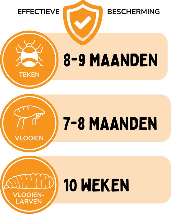 Le bandeau antipuces By Cee Cee contient les ingrédients actifs imidaclopride et fluméthrine. Ces ingrédients sont libérés lentement à faible dose et se répandent dans tout le corps de votre chien. Par conséquent, le collier offre une protection de 10 semaines contre les larves de puces, de 7 à 8 mois contre les puces et jusqu'à 8 à 9 mois contre les tiques.