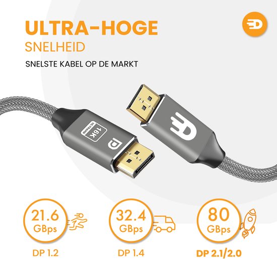 Drivv. Câble DisplayPort 2.1 - 16K 60Hz - 8K 120Hz - 4K 144Hz - 80Gbps - DisplayPort vers DisplayPort - Câble DP - 2 mètres - Gris