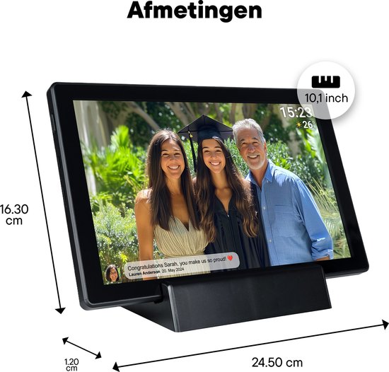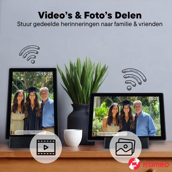 Partagez vos meilleurs souvenirs avec le cadre photo numérique Denver PFF-1070avec batterie rechargeable intégrée via l'application Frameo. Le superbe écran HD IPS affiche toutes vos photos dans une qualité époustouflante ! Avec ce cadre photo numérique, vous pouvez très facilement partager photos et vidéos de n'importe où dans le monde, et en un rien de temps ! Grâce à la batterie intégrée, il est possible d'utiliser le cadre photo dans n'importe quel endroit, sans dépendre d'une prise de courant. La station de recharge fait également office de support !