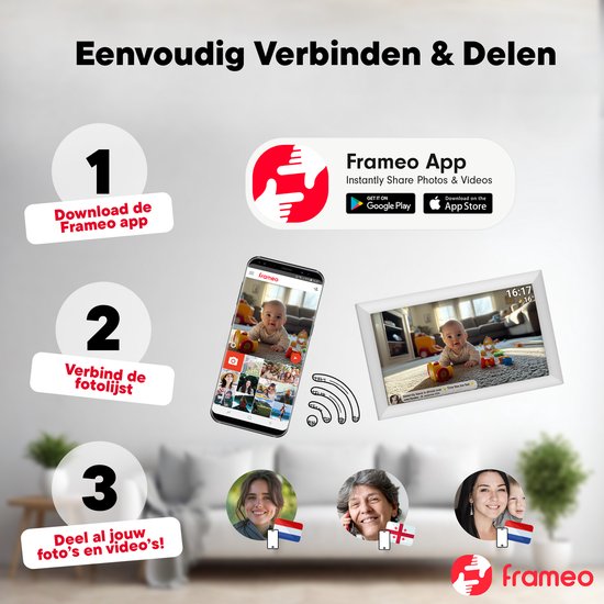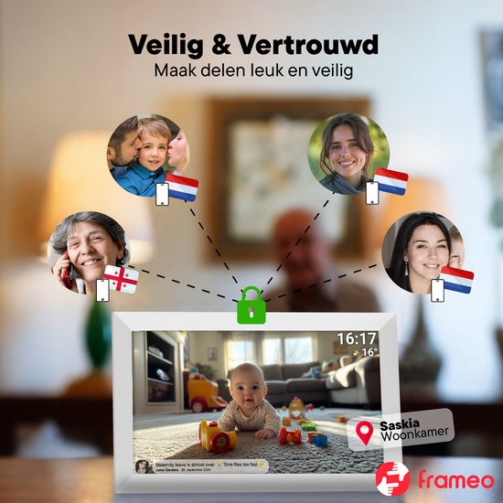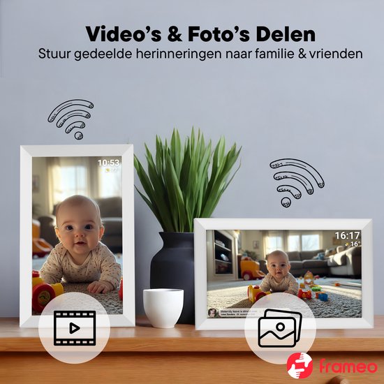 e et les amisAvec l'appli Frameo facile à utiliser, vous pouvez envoyer des photos ou des vidéos au cadre photo en quelques secondes, où que vous vous trouviez. Idéal pour faire participer à distance vos proches aux moments du quotidien ou aux occasions spéciales. Vous choisissez la durée pendant laquelle les photos restent visibles, l'affichage ou non de l'heure et de la météo, ainsi que les personnes qui ont accès au cadre photo. Grâce aux commandes conviviales de l'écran tactile, les réglages sont rapides.
