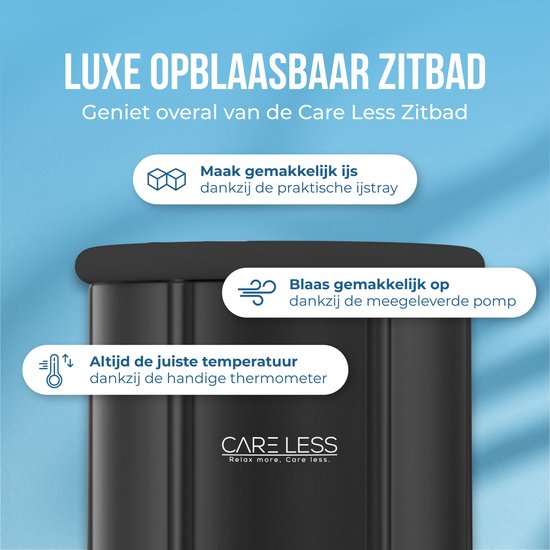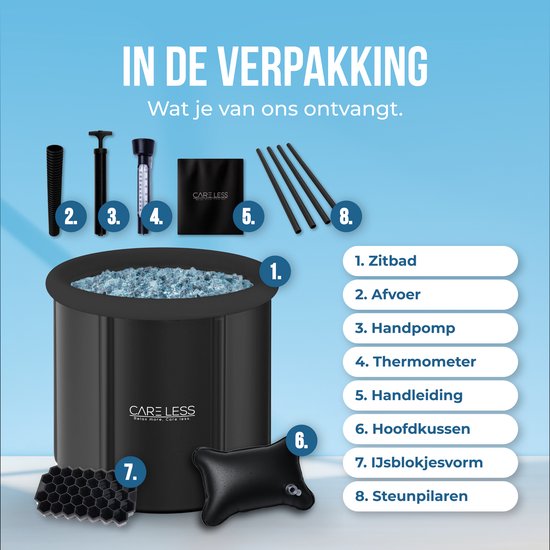 Le bain de glace Care Less est...livré avec divers accessoires qui rendent votre expérience à la fois confortable et pratique. Il s'agit notamment d'un thermomètre pour mesurer la température, d'un coussin de siège pour un confort optimal et d'une housse qui permet de garder l'eau propre. Grâce au robinet de vidange et au tuyau de vidange inclus, vider la baignoire est un jeu d'enfant.