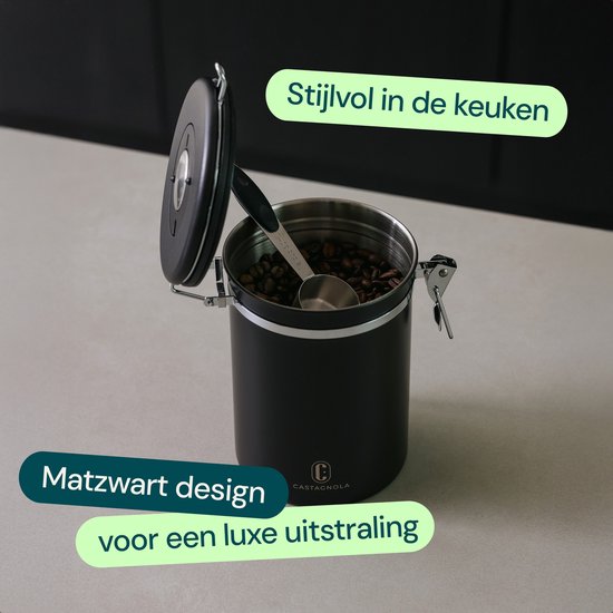 Boîte à café Castagnola 1,8L - Noir mat - hermétique avec sortie CO2 - 600 grammes - 12,5 x 12,5 x 19 cm