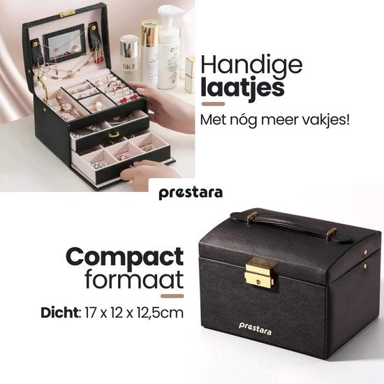 - Dimensions: Avec une taille compacte de 17,5 x 14 x 13 cm, la boîte à bijoux prend peu de place sur votre coiffeuse ou dans votre armoire, mais offre tout de même beaucoup d'espace de rangement.
