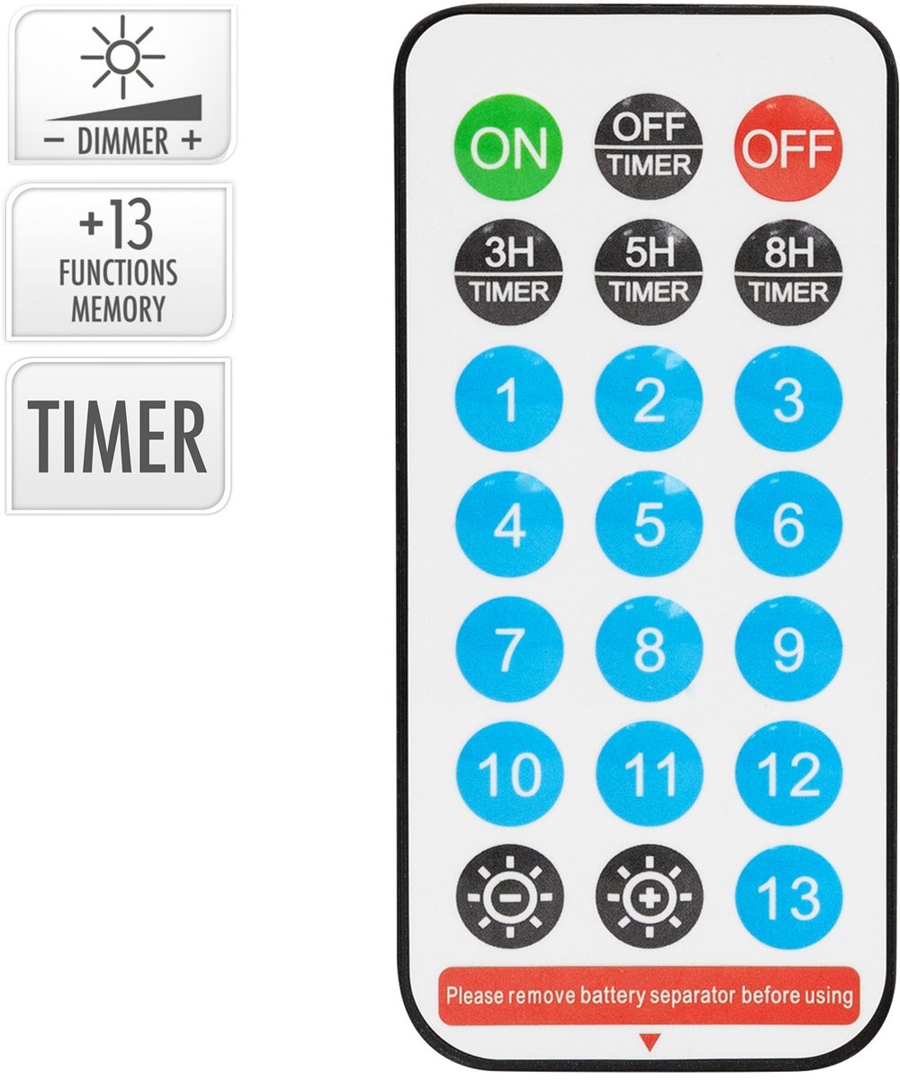 Les guirlandes lumineuses solaires avec 560 LED blanc chaud fournissent une lumière d'ambiance à l'intérieur et à l'extérieur. Grâce à son panneau solaire et à sa batterie rechargeable intégrée, elle est indépendante d'une source d'alimentation fixe et s'allume automatiquement à la tombée de la nuit. La télécommande fournie permet de choisir parmi 13 fonctions d'éclairage différentes, de faire varier la luminosité sur 3 niveaux et de régler des fonctions pratiques de minuterie (durée d'éclairage de 3h, 5h ou 8h). La fonction mémoire enregistre le dernier mode sélectionné et le restitue automatiquement après l'avoir rallumé. De plus, la batterie peut être rechargée si nécessaire via le câble USB fourni, ce qui est idéal pour les jours de faible ensoleillement. Caractéristiques 13 fonctions (voir l'image dans le manuel d'utilisation) Réglable à l'aide du bouton de mode du panneau solaire ou de la télécommande fournie Avec fonction mémoire (la dernière fonction est sauvegardée et rejouée après avoir été rallumée) Fonction minuterie (réglable à l'aide de la télécommande) : 3h d'éclairage / 5h d'éclairage / 8h d'éclairage - minuterie réglable Dimmable via la télécommande (3 niveaux de luminosité) Pour l'intérieur et l'extérieur (un éventuel manque de lumière du jour à l'intérieur empêche les lumières féeriques de fonctionner correctement) Fonctionnement sur piles Avec petit panneau solaire (avec pile et indicateur de mode, La batterie est chargée par la lumière du jour via le panneau solaire et s'allume automatiquement à la tombée de la nuit (cellules photoélectriques intégrées) Durée de charge à la lumière du jour 8-12 heures Durée d'éclairage dans l'obscurité +-6 heures en fonction de la période de l'année (durée de l'obscurité) La batterie peut également être chargée via un câble USB (USB type A à USB type B).(USB type A à USB type C) Contenu de la livraison 1 x guirlande lumineuse avec 560 LED 1 x panneau solaire avec batterie et écran 1 x télécommande 1 x câble USB (USB type A à USB type C) 1 x fiche de mise à la terre pour le panneau solaire Caractéristiques techniques Couleur du câble : Vert Couleur de la lumière : Blanc chaud LED : 560 pcs Distance entre les LED : 2 cm Longueur de la guirlande : env. 1100 cm Longueur du câble : env. 300 cm Fonctions : 13 modes, fonction mémoire Fonctionnement : sur le panneau solaire ou via la télécommande Minuterie : 3h / 5h / 8h (réglable via la télécommande) Variable : 3 niveaux de luminosité (via la télécommande) Alimentation : énergie solaire avec batterie rechargeable intégrée, alternativement rechargeable via USB Durée de charge : environ 8-12 heures à la lumière normale du jour Durée d'éclairage : environ 6 heures (en fonction de la saison et de l'obscurité) Domaine d'application : intérieur et extérieur (l'utilisation en intérieur nécessite une lumière du jour suffisante pour la charge)