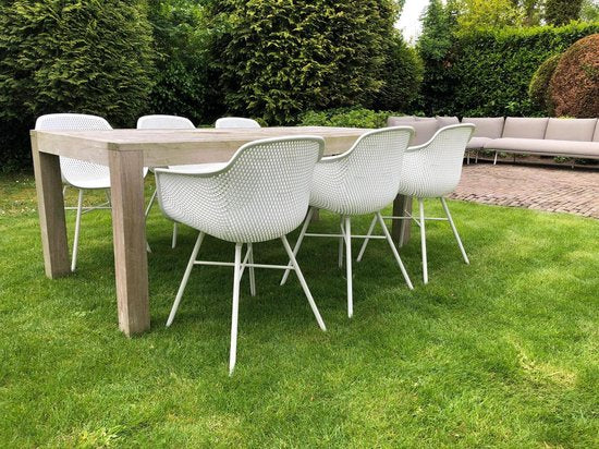 Les chaises ont une coque en plastique robuste qui offre une assise confortable. Le cadre en métal revêtu offre une stabilité supplémentaire et est hydrofuge, ce qui rend les chaises très résistantes aux diverses conditions météorologiques. Elles restent donc belles, saison après saison.