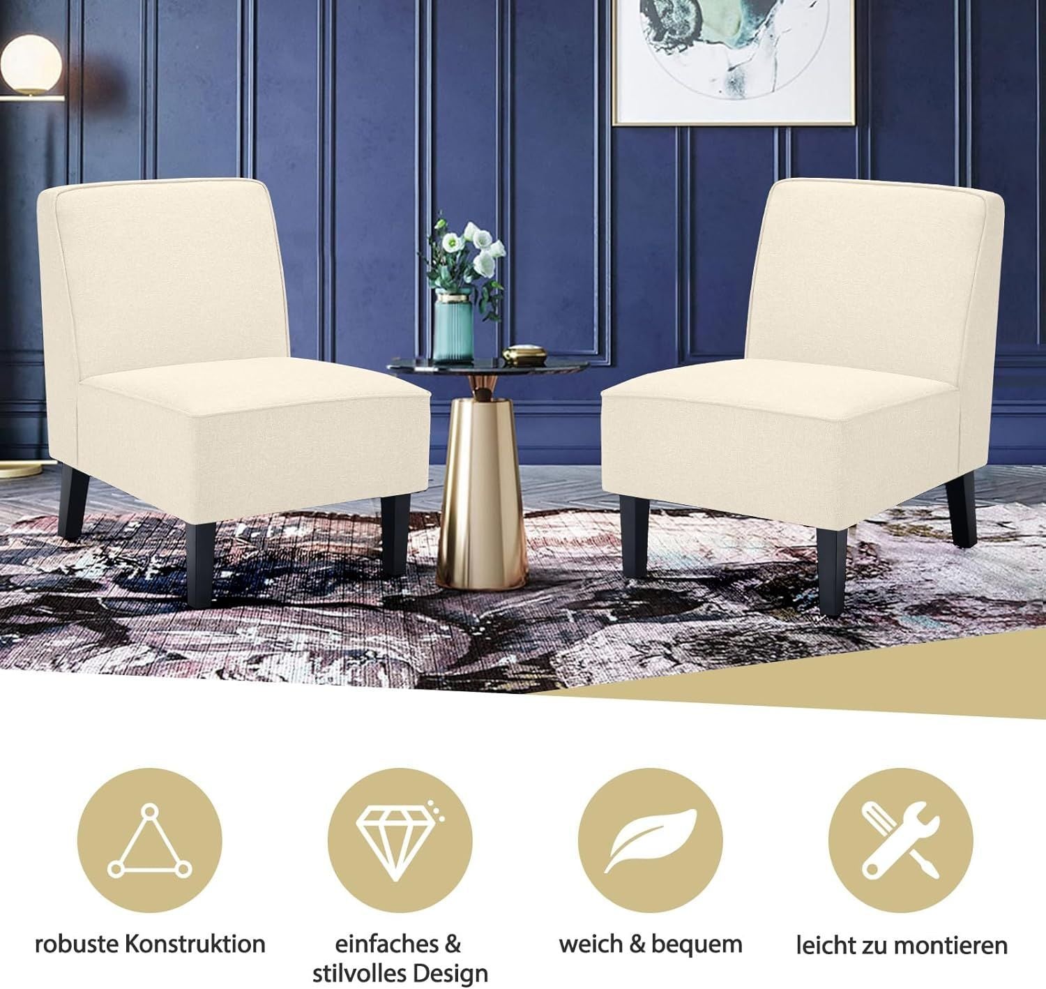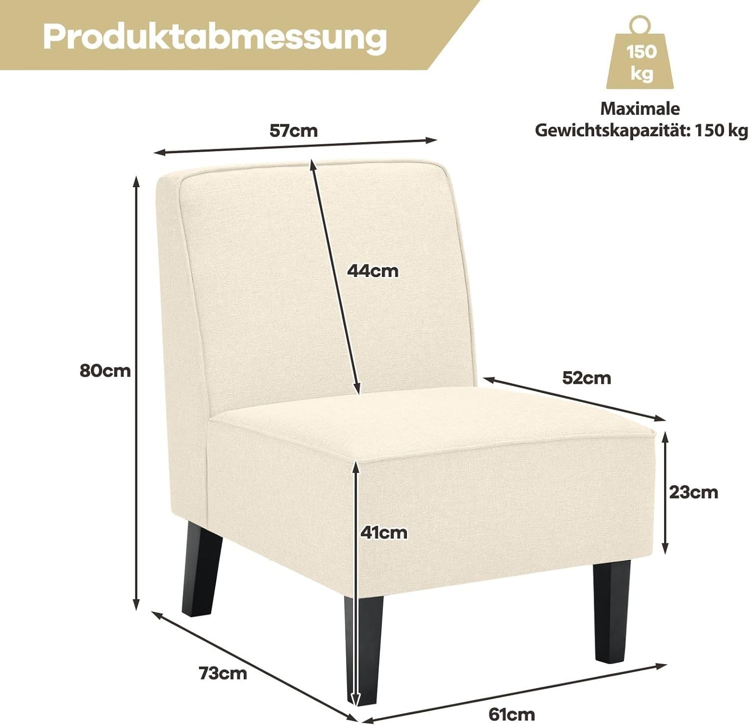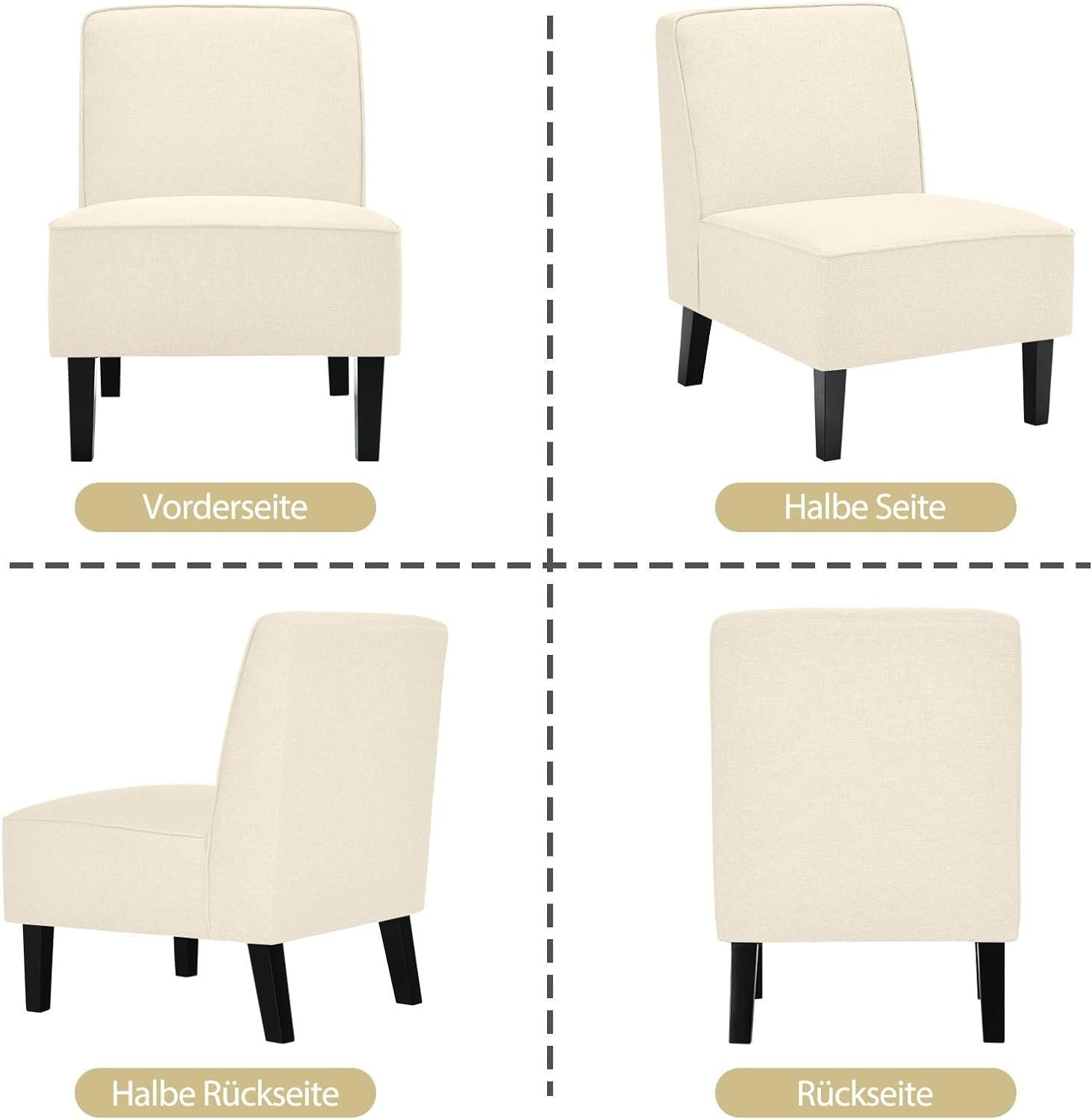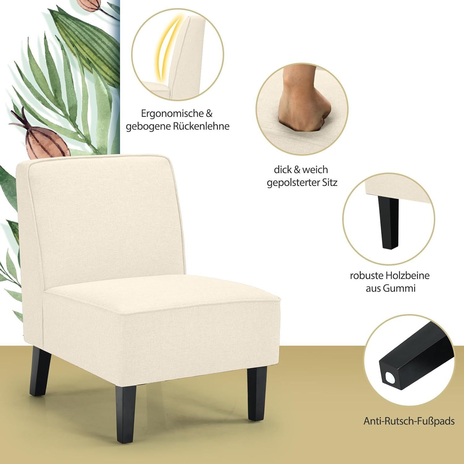 Siège spacieux avec coussin épais Ce fauteuil d'appoint est recouvert de coussins épais et moelleux remplis d'une éponge haute densité, vous permettant de vous asseoir confortablement. De plus, ce fauteuil d'appoint a une assise large et profonde avec des ressorts élastiques à l'intérieur, vous offrant une prise ferme mais douce. Construction en bois robuste et de haute qualité Ce fauteuil sans accoudoirs est constitué d'un cadre robuste d'une capacité de charge de 150 kg. Il est donc stable et suffisamment solide pour garantir une longue durée de vie. Les 4 pieds en bois massif sont munis de goujons antidérapants sur la face inférieure afin d'éviter de rayer le sol tout en augmentant la stabilité. Dossier large et tissu respirant Ce fauteuil de loisir est doté d'un dossier large et légèrement incliné, qui soutient fermement l'ensemble du corps. Vous êtes ainsi plus à l'aise et vous risquez moins de vous fatiguer lorsque vous vous appuyez sur le dossier. De plus, le fauteuil est revêtu d'un tissu en lin, respirant et résistant. Un style élégant et des applications polyvalentes Ce fauteuil simple et moderne s'adapte à tous les intérieurs et ajoute une touche d'élégance à votre espace de vie. Vous pouvez placer ce fauteuil d'appoint multifonctionnel dans votre salon, votre chambre à coucher, votre salle à manger, votre bureau ou même sur le balcon pour prendre une tasse de café ou vous détendre. Assemblage facile et dimensions du produit Cette chaise d'appoint a un design simple et est facile à assembler en suivant les instructions claires. De plus, chaque pièce et vis a son propre code, ce qui vous permet de terminer l'assemblage en peu de temps. Dimensions de la chaise : 73 cm x 61 cm x 80 cm (L x l x h). Dimensions de l'assise : 61 cm x 52 cm (L x l). Description de la chaise : Cette chaise d'appoint moderne et confortable est un ajout parfait à votre maison ! Cette chaise sans accoudoir est soutenue par quatre pieds en bois de caoutchouc, offrant une grande robustesse et stabilité pour une utilisation à long terme. De plus, les pieds antidérapants sont conçus pour éviter de glisser involontairement et d'endommager votre sol. Cette chaise ergonomique est dotée d'un dossier réglable et d'un coussin épais, pour un confort d'assise optimal. Le revêtement en lin respirant et doux améliore la sensation tactile et le confort. Cette chaise multifonctionnelle peut être utilisée comme fauteuil inclinable dans le salon, comme chaise d'appoint dans le hall d'accueil et comme fauteuil de lecture dans le bureau. Profitez de votre temps libre avec ce fauteuil ergonomique ! Caractéristiques : Structure solide garantissant une stabilité et une durabilité élevées Doublé de coussins en éponge doux et épais pour un grand confort. Le dossier ergonomique s'adapte à votre corps et soulage la fatigue. Pieds en caoutchouc avec patins antidérapants pour la stabilité et la protection du sol La housse en lin est respirante et résistante. Le design frappant et moderne s'intègre bien à tous les intérieurs. Parfait pour le salon, le bureau, la chambre à coucher, le balcon, le bureau, etc. La capacité de charge maximale est de 150 kg Assemblage facile grâce à des instructions détaillées