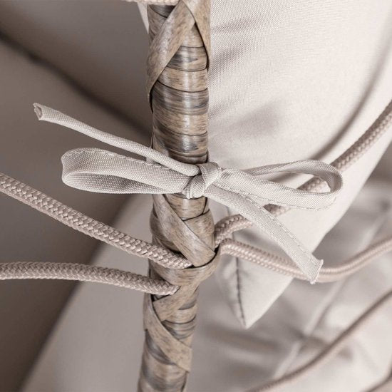 Ce fauteuil suspendu n’est pas résistant aux intempéries ni aux UV. Il peut être laissé à l’extérieur uniquement dans un espace abrité et pendant la belle saison. Le coussin doit être conservé au sec lorsqu’il n’est pas utilisé.