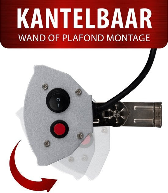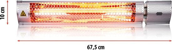 Un kit de montage composé de supports et de vis est inclus avec la lampe chauffante. Grâce à eux, vous pouvez accrocher le chauffage au mur ou au plafond. C'est très pratique, car cela ne prend pas de place au sol. Le chauffage mesure environ 67,5 x 10,5 x 7 centimètres. Vous pouvez l'incliner et ainsi diriger la chaleur là où vous le souhaitez.