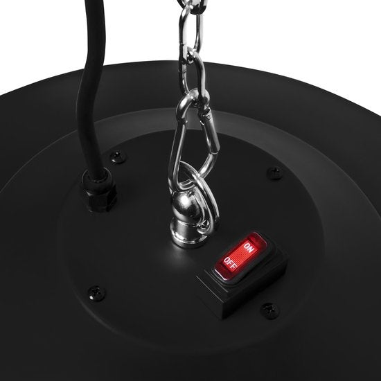Installation facile : l'appareil est livré avec une chaîne de 50 cm et 2 mousquetons, ce qui vous permet de suspendre le chauffage au plafond ou sous un parapluie sans aucune difficulté.