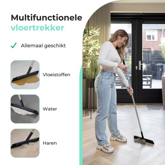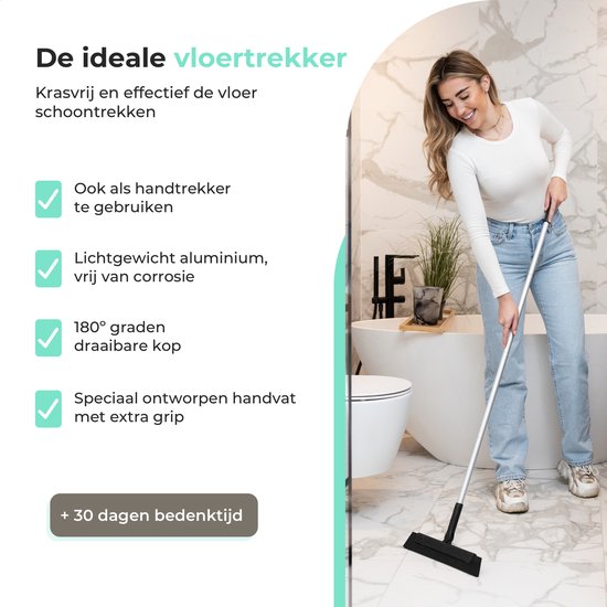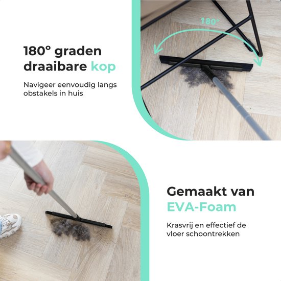 La tête rotative de cette raclette de sol permet d'éliminer facilement l'eau ainsi que les saletés et la poussière. Grâce à la fonction de pivotement à 180 degrés, vous pouvez atteindre les moindres recoins, ce qui est parfait pour une utilisation dans le salon et la salle de bains.