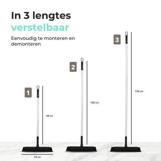 La poignée réglable, d'une longueur de 68 à 130 cm, vous permet de nettoyer à n'importe quelle hauteur sans avoir à vous pencher. Pour plus de commodité et de polyvalence, vous pouvez facilement détacher la raclette à eau, ce qui vous permet de passer rapidement d'une raclette à main à une raclette de sol pour différentes tâches de nettoyage.