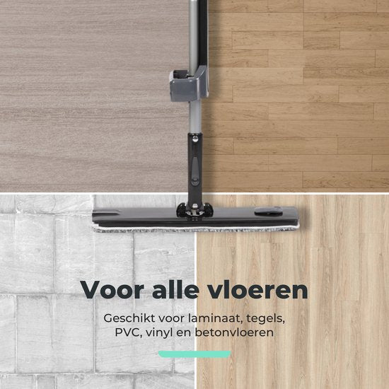Cet ensemble de serpillière avec serpillière en spray convient à une variété de types de sols, tels que le PVC, les carreaux, le stratifié et le vinyle. Cela en fait une option polyvalente pour tous les ménages, quel que soit le type de sol.