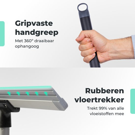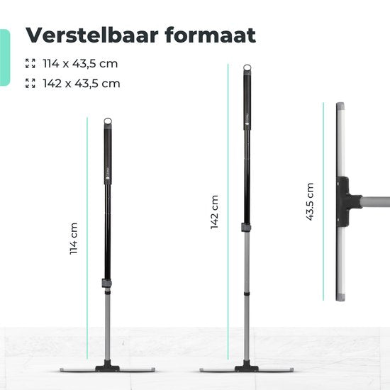 Avec une largeur impressionnante de 43,5 cm, cet essuie-glace de sol offre une efficacité maximale. La grande surface signifie que vous devez passer moins de temps à nettoyer parce que... vous pouvez nettoyer plus de surface à chaque balayage. Ceci est particulièrement utile pour les grandes salles de bains ou les pièces.