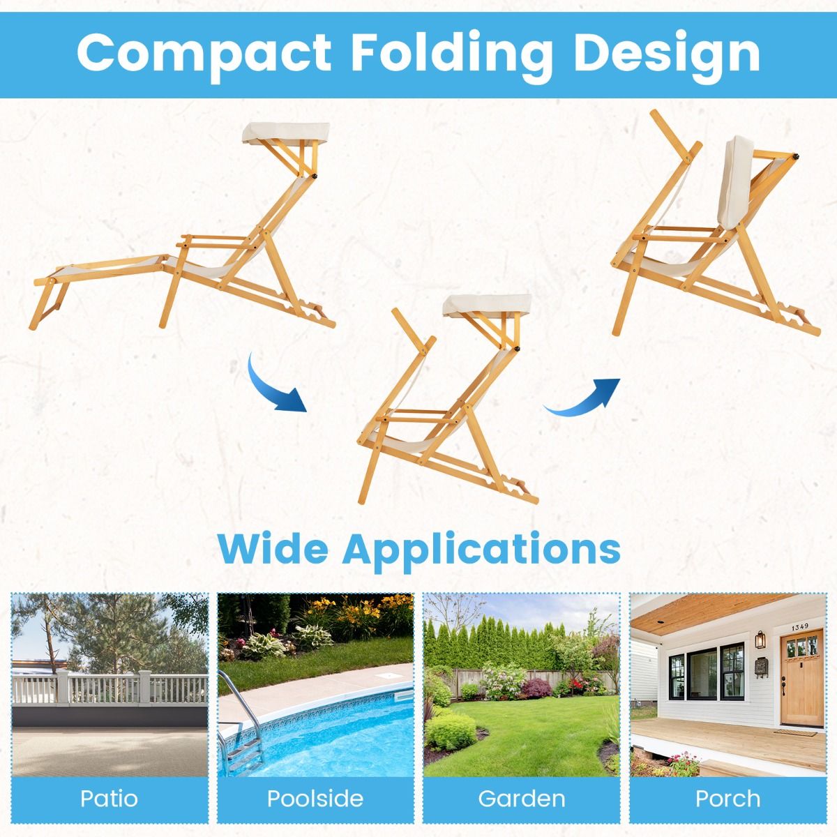 Chaise longue de plage pliante en bouleau de la côte avec auvent, dossier et repose-pieds réglables