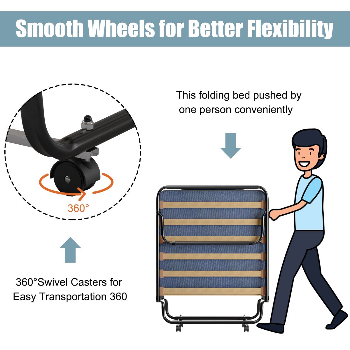4 roulettes pivotantes à 360° vous permettent de déplacer facilement le lit pliant dans n'importe quelle position. Ce lit d'appoint avec son matelas douillet en mousse à mémoire de forme est le choix idéal pour accueillir vos invités ou vos amis, faire une sieste pendant votre pause déjeuner ou vous détendre lors de votre prochain voyage.