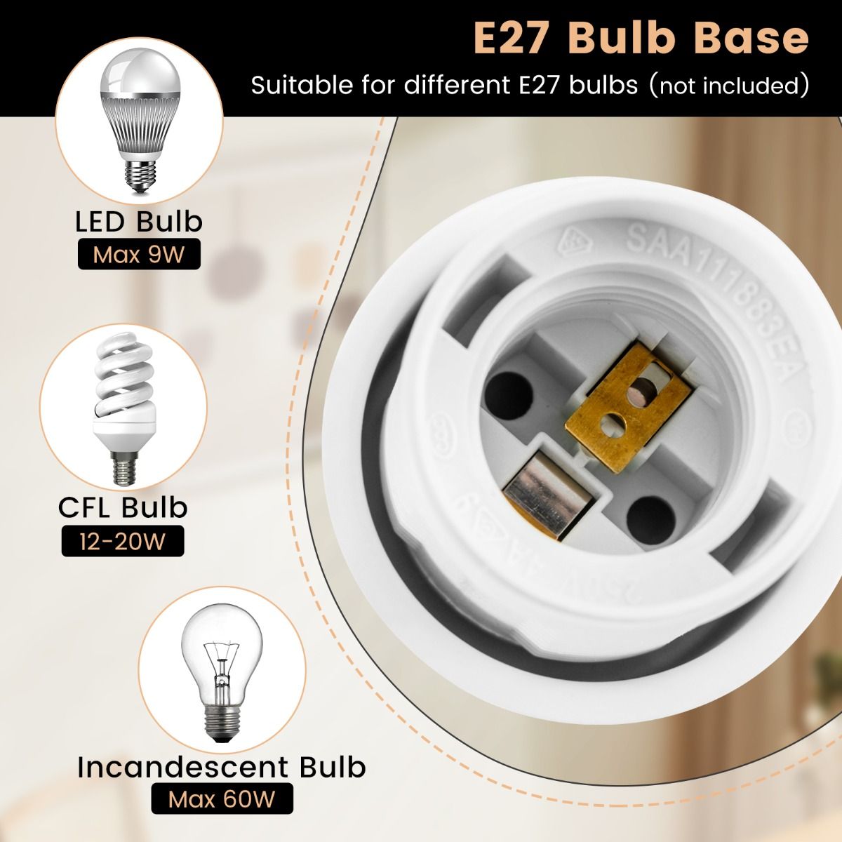 - Puissance maximale compatible : 9W (LED) / 60W (lampe à incandescence)