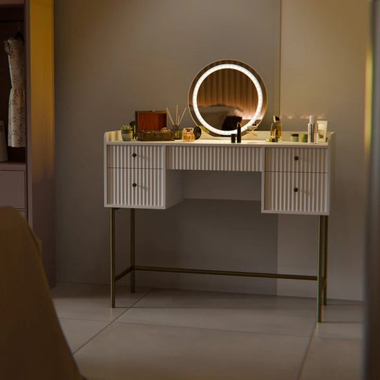 Avec cinq tiroirs, la table offre beaucoup d'espace pour le maquillage, les bijoux et les outils de coiffure - le tout à portée de main et organisé.