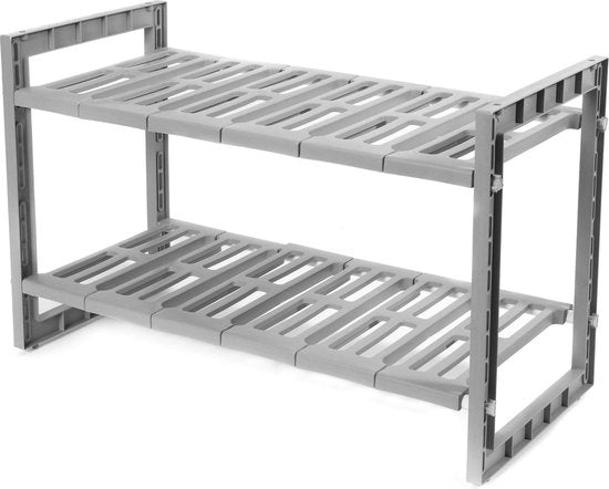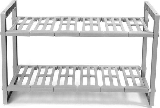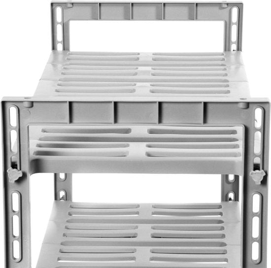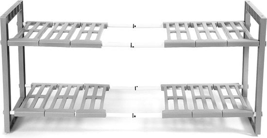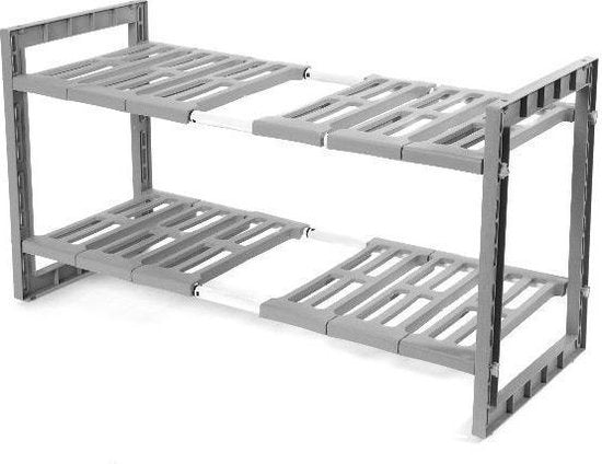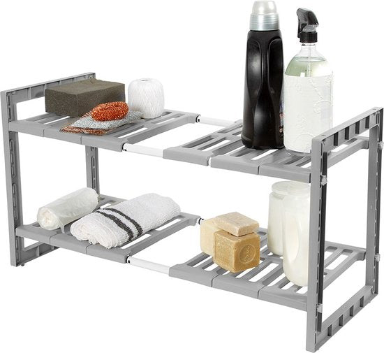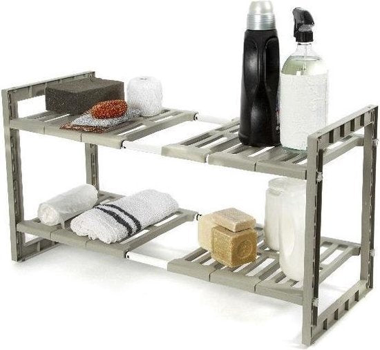 Un support simple mais extrêmement pratique pour le meuble évier. Le support est extensible de 48 à 85 cm de largeur, ce qui permet de l'adapter facilement à n'importe quel meuble d'évier. Les étagères sont facilement amovibles, ce qui permet de placer le support autour du siphon sans problème. Ce support pour évier est fabriqué en plastique gris solide et durable. Avec ses deux niveaux, il offre un vaste espace de rangement. Comme il est extensible, le support de meuble pour évier peut être parfaitement adapté à l'espace dont vous disposez. L'unité a une largeur de 48 cm, une profondeur de 30 cm et une hauteur de 40 cm, avec une extension maximale de 85 cm. L'organisation de votre meuble d'évier est très pratique lorsque vous souhaitez ranger beaucoup de choses. Pensez au liquide vaisselle, aux serviettes, aux torchons, aux brosses à vaisselle, aux éponges, etc. Malheureusement, ces petits objets en vrac encombrent souvent votre meuble sous évier. Comment organiser au mieux votre évier ? Avec ce support de Compactor pour votre évier, vous pouvez... rassembler tous vos accessoires dans un endroit pratique et structuré. Adaptez le support sous l'évier à votre armoire et organisez soigneusement toutes vos affaires. Organiser un meuble sous évier n'a jamais été aussi facile ! Vous souhaitez acheter un meuble sous évier maintenant ?