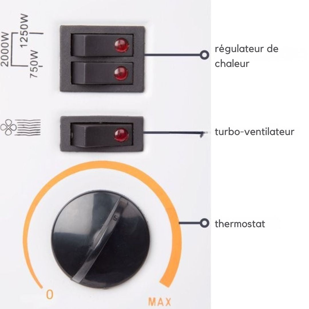 - Trois réglages de chaleur pour ajuster la température selon vos besoins : 750 W, 1250 W et 2000 W.