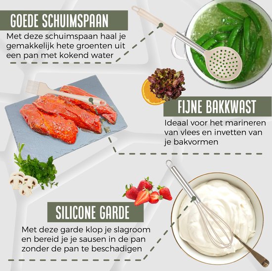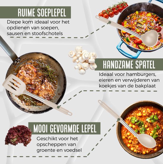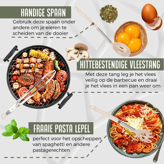 Cet ensemble d'ustensiles de cuisine et de support assorti rend la cuisine encore plus agréable. Cet ensemble vous permet d'être polyvalent et de préparer des plats variés. L'avantage de cet ensemble est que les ustensiles sont fournis avec un support et des crochets, ce qui permet de les suspendre facilement. Vous pouvez conserver les outils dans le support pour une cuisine bien rangée, ou les suspendre pour garder une vue d'ensemble pendant que vous cuisinez.