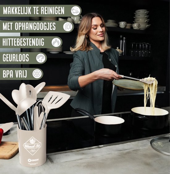 Les ustensiles de cuisine Coock offrent un ensemble complet avec des outils de cuisine suspendus extra-larges pour la cuisine et la pâtisserie. Cette batterie de cuisine est résistante à la chaleur jusqu'à 250 degrés Celsius. La batterie est fabriquée en silicone, de plus, elle estsans BPA, sans latex et sans plastique, ce qui signifie qu'elle n'a pas d'effets nocifs sur votre santé. Il est adapté aux poêles antiadhésives, vous n'endommagerez donc pas vos poêles. En outre, ils sont résistants aux taches et faciles à nettoyer. Le set d'ustensiles avec support est fabriqué en acier inoxydable avec des extrémités en silicone, ce qui le rend respectueux du lave-vaisselle.