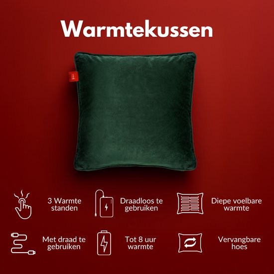 Coozie Rechargeable Heat Pillow - sans fil et filaire - 45-65°C - Velours - 45 x 45 cm - Vert foncé - Oreiller électrique - Powerbank incluse - Jusqu'à 8 heures de chaleur